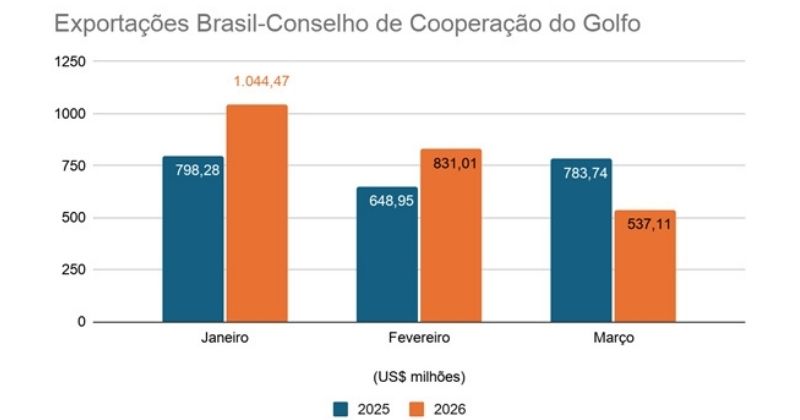 As exportações brasileiras para os países do Golfo recuaram 31,47% em março, impactadas pelo conflito no Oriente Médio iniciado no fim de fevereiro. Ainda assim, o desempenho no primeiro trimestre de 2026 permanece positivo, com crescimento de 8,14% e total de US$ 2,41 bilhões.