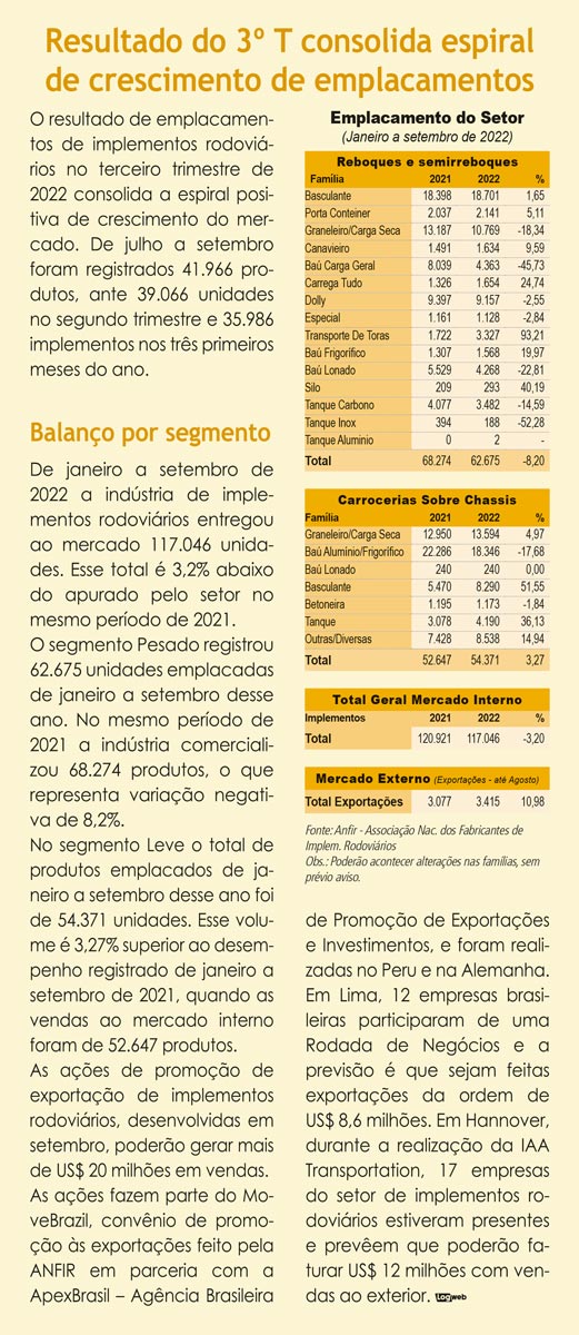 Para o próximo ano, a ANFIR entende que os negócios seguirão no rumo do resultado positivo.“O mercado de implementos rodoviários e as empresas associadas à ANFIR têm boa expectativa para 2023, com a manutenção da espiral positiva de crescimento nos segmentos mais importantes para o setor, como o agronegócio”, afirma Spricigo.