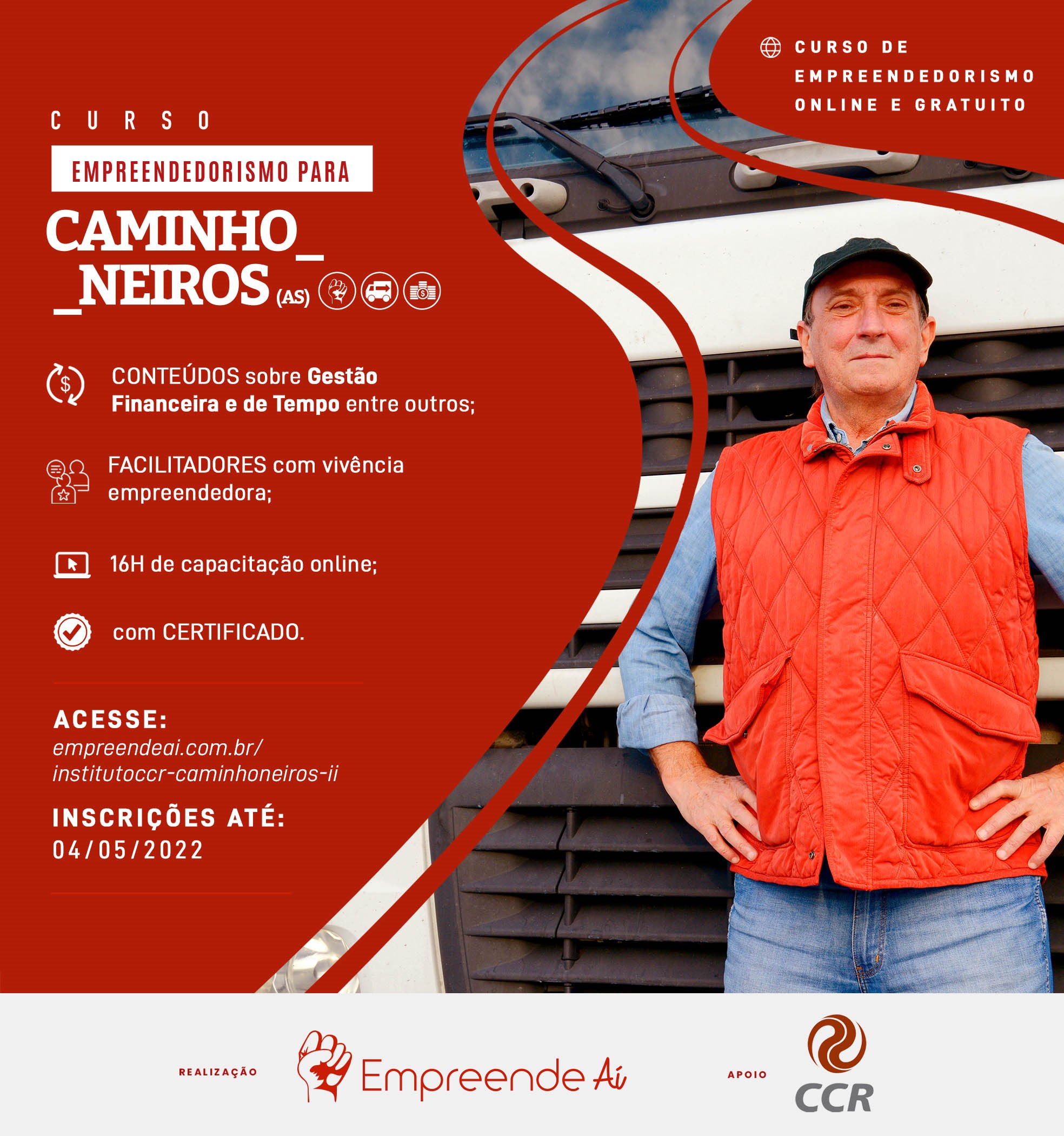 O “Curso Empreendedorismo Para Caminhoneiros” está aberto para homens e mulheres de todo Brasil. As inscrições são gratuitas e devem ser realizadas até 04/05/22 no site: https://empreendeai.com.br/institutoccr-caminhoneiros-ii/
