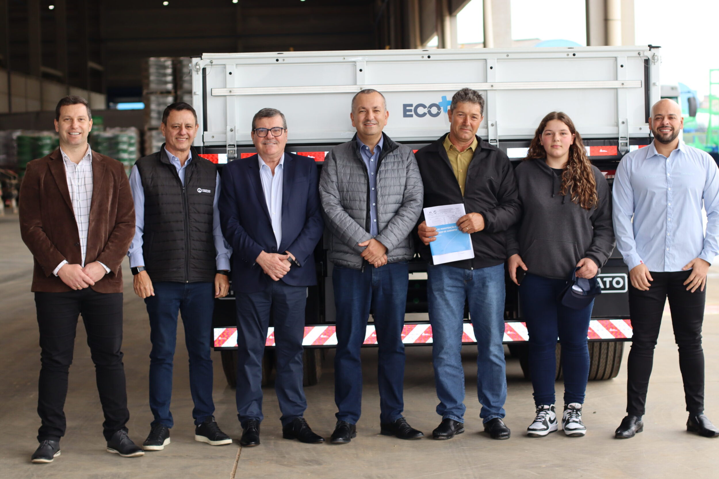 Estão na foto representantes da diretoria da Librelato, do Consórcio Librelato e da concessionária Riograndense, além do primeiro vencedor da promoção “Engate sua Sorte 2024”