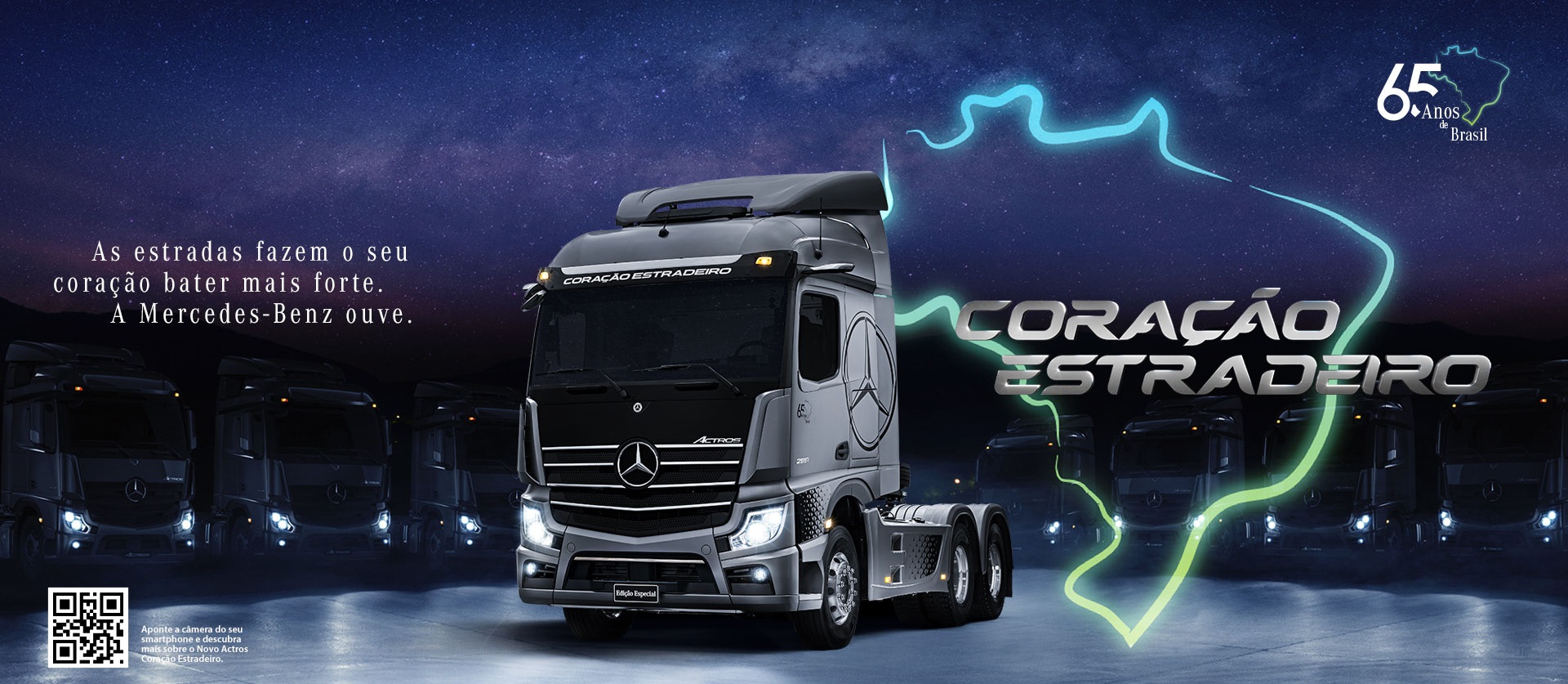 • Actros “Coração Estradeiro”: cor cinza Galcon fosca, adesivação personalizada, grade dianteira da cabina black piano com frisos cromados, defletor de teto, defletores laterais, geladeira de 25 litros, rodas de alumínio, pistola de ar em alumínio para limpeza interna da cabina, side skirt (saias laterais) Alliance e TV Alliance.